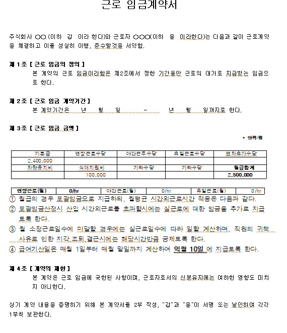21년도에 입사시에 아래와 같이 근로계약서를 작성 하였습니다.