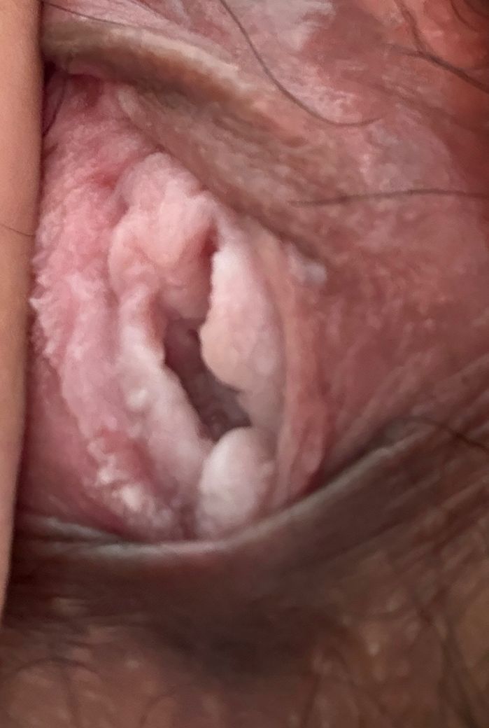 곤지름은 표면이 비교적 단단하고 사마귀처럼 돌출된 병변이 지속적으로 남아 있으며, 닦이거나 긁는다고 흰 찌꺼기가 묻어나오지 않습니다. 반면 사진처럼 질 입구 점막이 하얗게 덮여 있고, 문지르면 치즈·두부 찌꺼기 같은 분비물이 떨어지는 양상은 칸디다 질염에서 흔히 보입니다. 점막이 불균일해 보이는 것도 염증과 분비물이 붙어 있어서 그렇게 보일 수 있습니다.