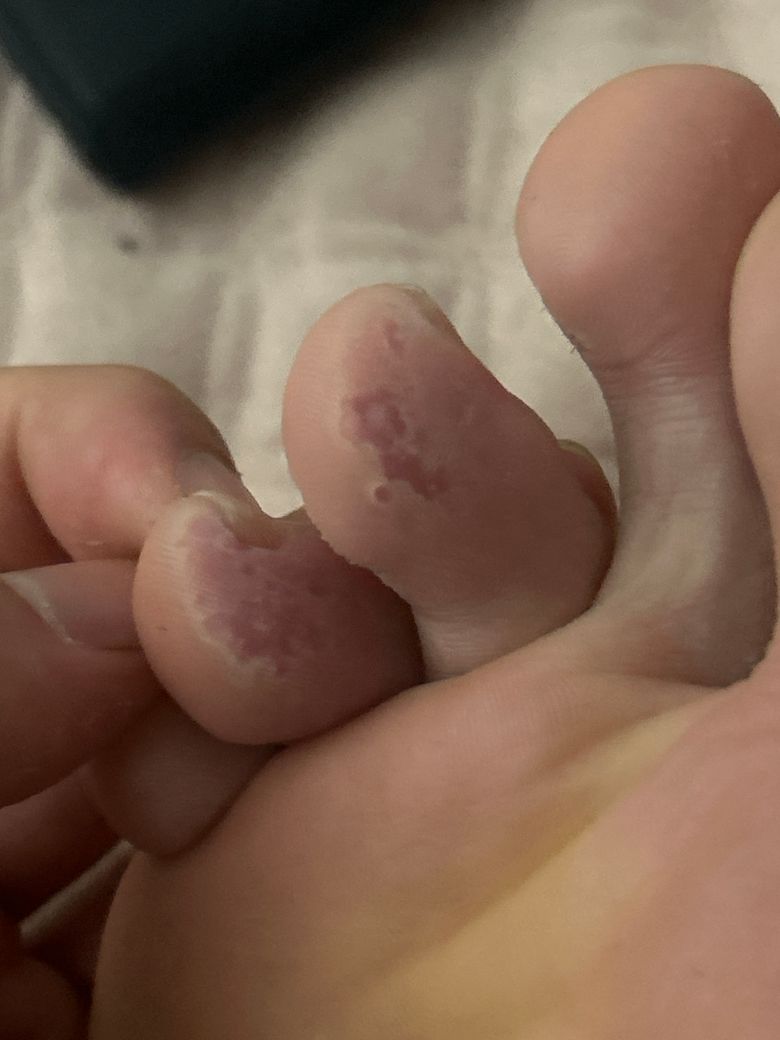 발가락 피부 사진을 보니 무좀균이 퍼져서 발가락 피부가 벗겨지신것으로 보입니다.피부과 가셔서 연고처방 받아보세요.