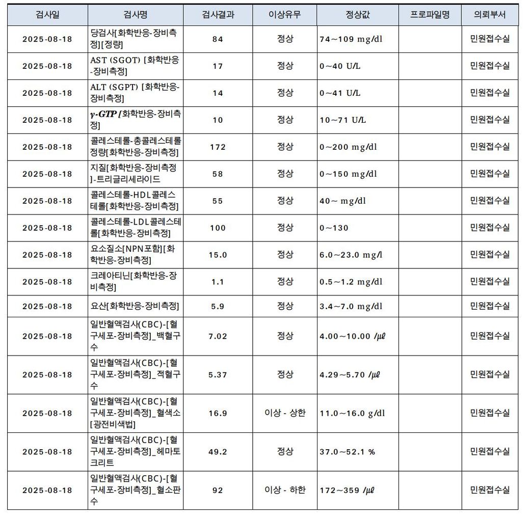 최근에 보건소에서 하는 피검사와 요검사를 받았습니다.