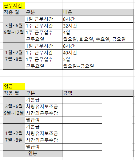 일정 기간에 대해서 근로시간이 달라지는 경우에는 그림과 같이 일정기간에 대한 근로시간을 명시하는 것으로 해결 가능합니다.