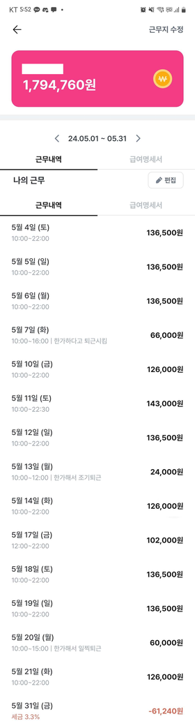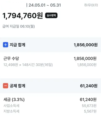 평일 시급 12000, 주말 시급 13000 적고 돌렸던 계산기인데요.