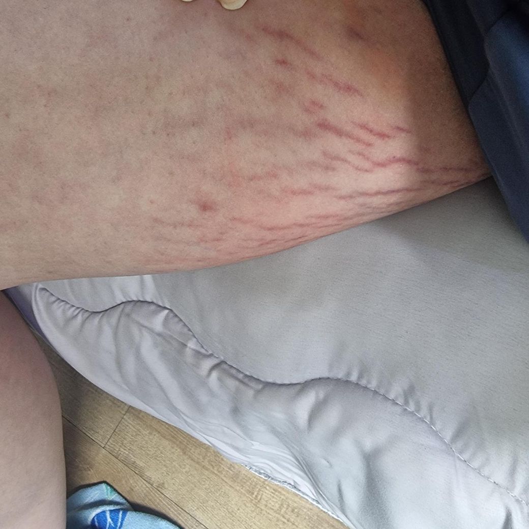 사진의 소견만을 통해서 구체적이고 정확한 감별 진단을 내리는 것은 가능하지 않습니다만, 사진을 보았을 때에는 튼살처럼 보이는 피부 소견으로 보입니다. 최근 급격한 체중 증가 또는 부종 같은 증상이 있을 경우에 더욱 가능성이 높다고 볼 수 있습니다. 피부 진정을 위해서 잘 보습을 해주고 케어해주시길 권고드리며, 혹시 다른 문제가 있는 것일 수도 있는 만큼 관련하여서는 피부과에서 구체적으로 진료 및 검진을 통해서 명확한 상태 감별 진단을 받아보시는 것을 권고드립니다.