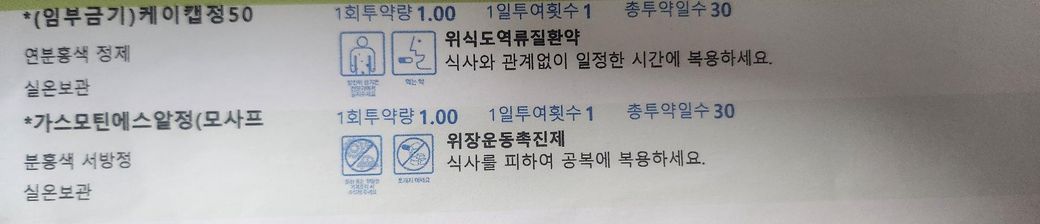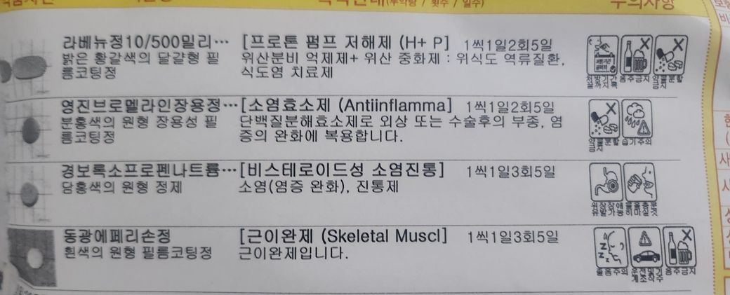 문의주신 사진의 약들에서 위산분비를 억제하는 위장약이 중복되기에 정형외과 약의 위장약은 복용하지 말고 내과약의 위장약 만 복용을 권장드립니다