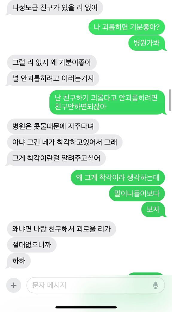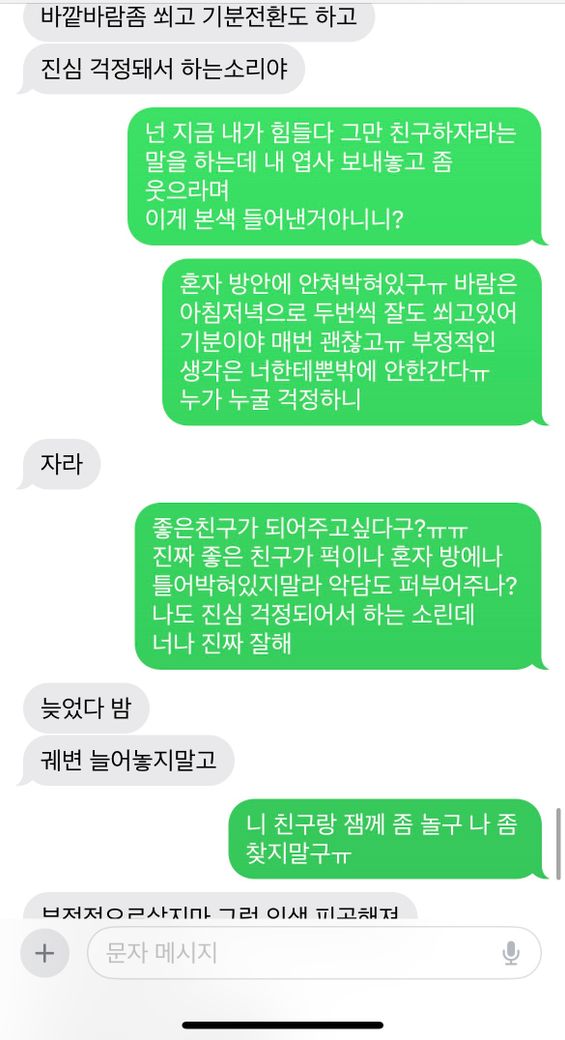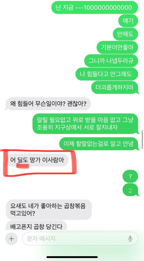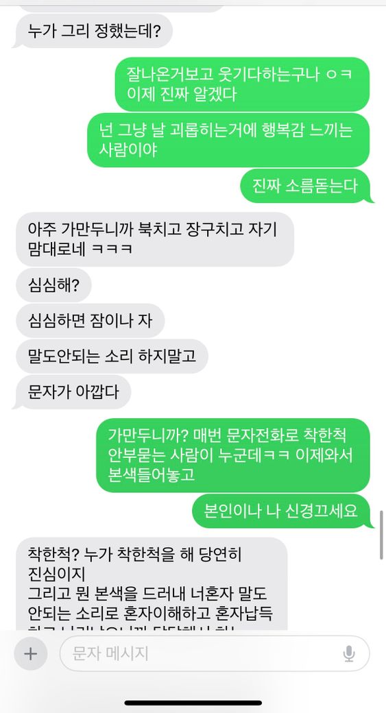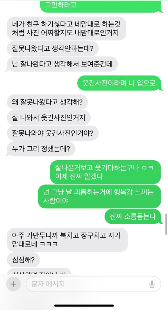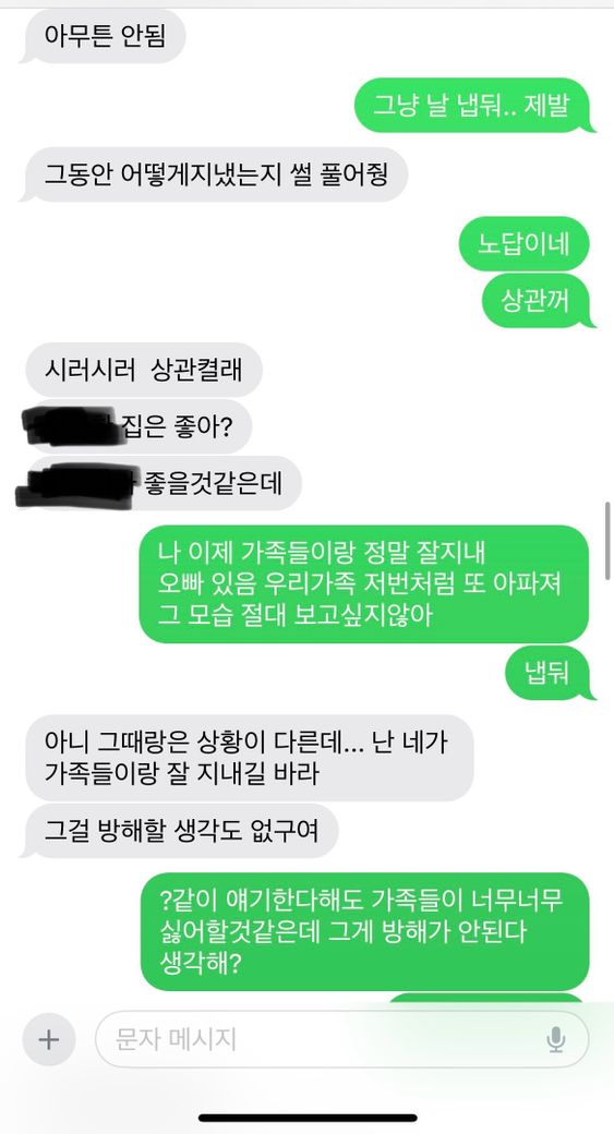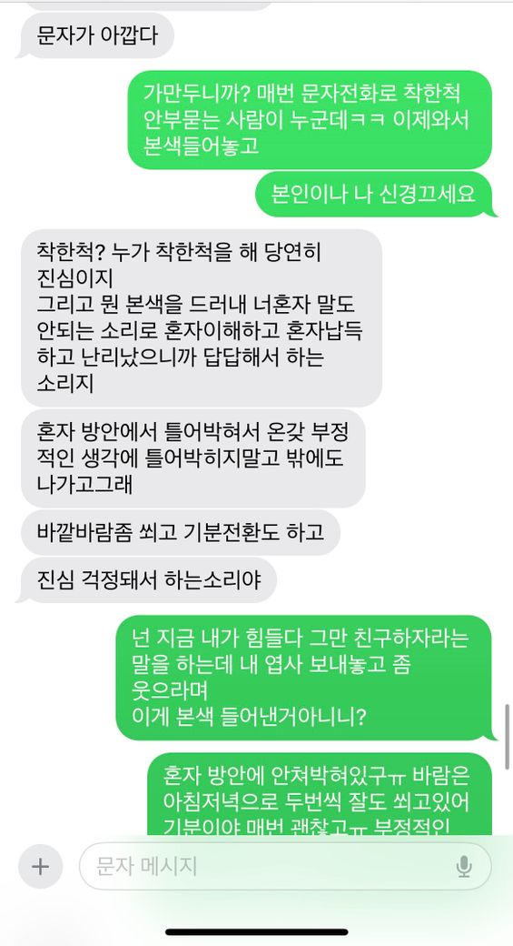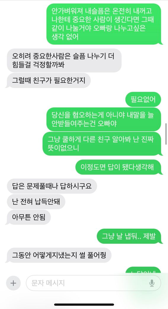 그래서 차단을 풀고 다시 한번 전화든 뭐든 제발 연락하지 말아달라고 얘기하였고, 부탁 한 후가 아래 내용입니다. 안부 인사정도 하는게 뭐가 그리 잘못됐고, 거절하는지 이해가 안가서 자기 뜻대로 하겠답니다.