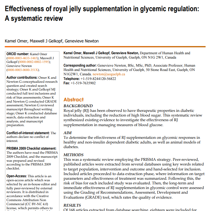 Quality of evidence suggesting that RJ is an effective modulator of glycemic regulation is low for long-term effects of RJ, and very low for immediate effects.