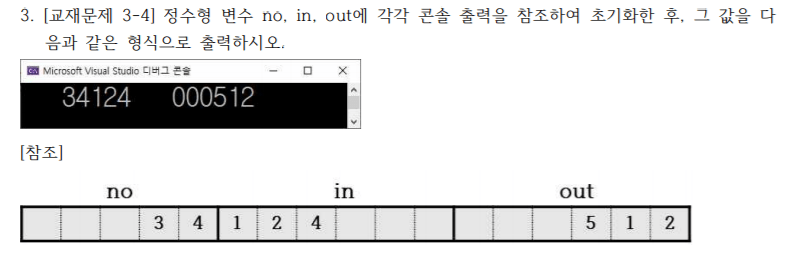 [교재문제 3-4] 정수형 변수 no, in, out에 각각 콘솔 출력을 참조하여 초기화한 후, 그 값을 다 음과 같은 형식으로 출력하시오.