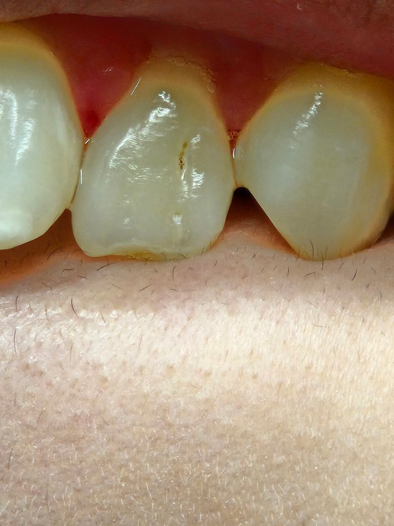 현재 충치가 발생이되어 있는 것으로 보이며 보다 정확한 상태 확인을 위해 치과 진료를 받길 권합니다.