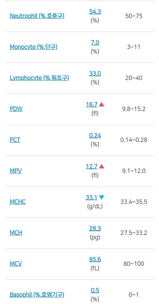 PDW랑 MPV가 정상수치보다 높다고 나오고 MCHC는 낮다고 나오는데 무슨 수치이고 문제가 있는건지 궁금합니다.....