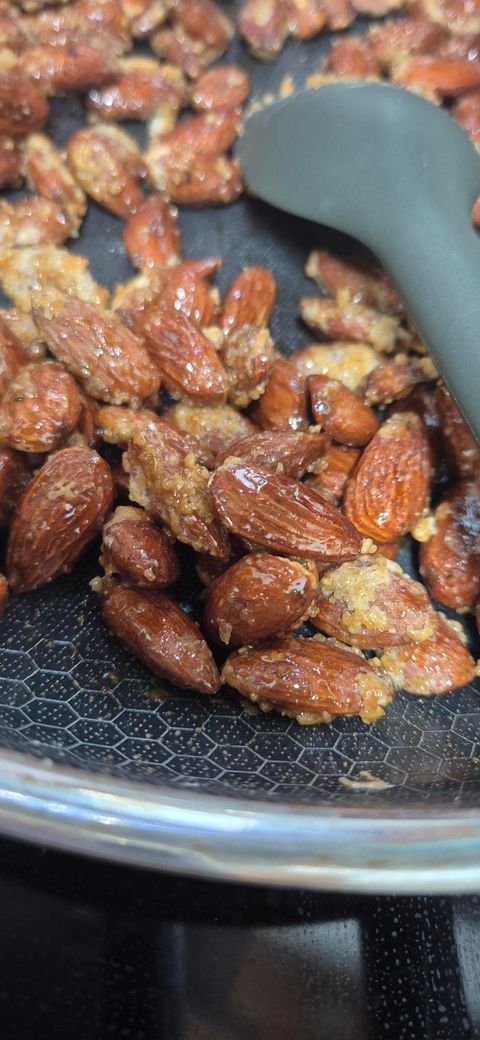 가염 아몬드는 이미 소금이나 기름이 코팅돼 있어서 설탕 시럽이 제대로 흡착되지 않거나 결정화가 더 쉽게 생길 수 있어요. 설탕 결정이 생겼다면 약불에 다시 올려서 천천히 녹여주면서 버터를 살짝 넣어주면 캐러멜화가 되면서 표면이 매끈해질 수 있어요. 이때 너무 센 불은 피하고, 계속 저어주면서 결정이 녹는 걸 확인하는 게 중요해요. 개인적으로는 무염 아몬드를 쓰는 게 훨씬 안정적이고 결과물도 예쁘게 나와서 추천드리고 싶어요. 지금 상태도 완전히 망한 건 아니니까 천천히 녹여보면서 복구해보세요.