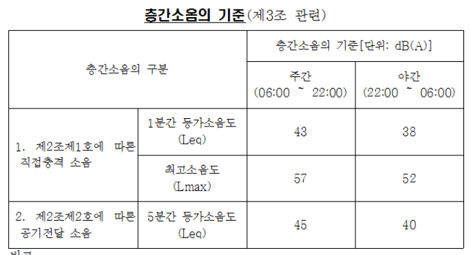 아래는 층간소음의 기준에 대해 명시한 환경부의 공동부령입니다.