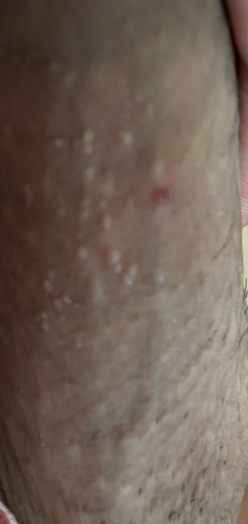 사진만으로는 확실치 않지 적어주신 내용과 종합해보면 모낭염이나 성기 헤르페스 가능성이 있어 보입니다.
