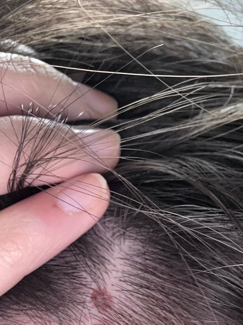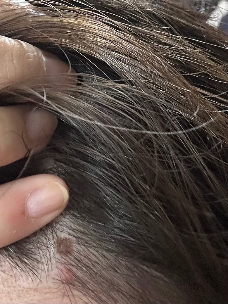 사진상 두피 병변은 경계가 비교적 뚜렷한 갈색 색소 병변으로 보이며, 표면이 약간 거칠거나 각질이 동반된 부위도 관찰됩니다. 다만 단일 사진만으로는 양성 색소성 모반인지, 지루각화증인지, 또는 비정형 병변인지 구분은 제한적입니다.