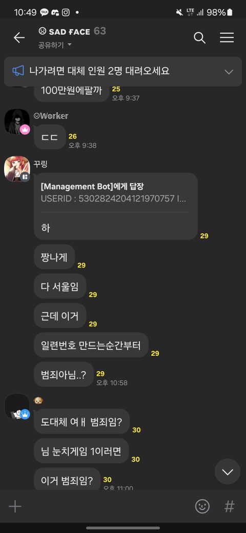 아래 사진처럼 오픈채팅방에 들어오는 사람의 개인정보(아이피 같은거)를 카카오톡 로코 프로토콜로 수집한뒤 일련번호를 만들어서 관리하고있는듯합니다. 아직은 피해가 발생하지않았지만 아이피도 일종의 개인정보로 알고있고 “짱나게 다서울임” 이라는 말을보면 이것으로 사는곳 또한 찾을수있는거같습니다. 혹시 이거 개인정보침해로 고소같은거 가능할까요? 보통 사이트가입할때 나오는 개인정보수집동의같은것도 없었습니다