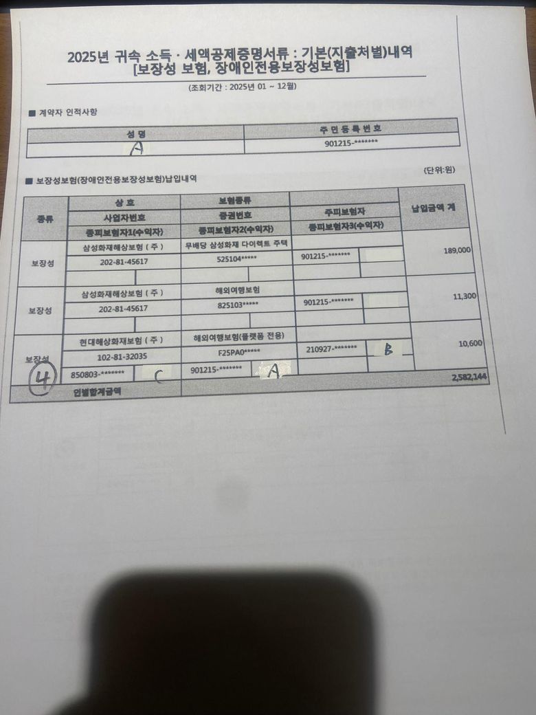 위 사진은 장애인이 아닌 보장성 보험료에 관한 간소화 자료입니다.