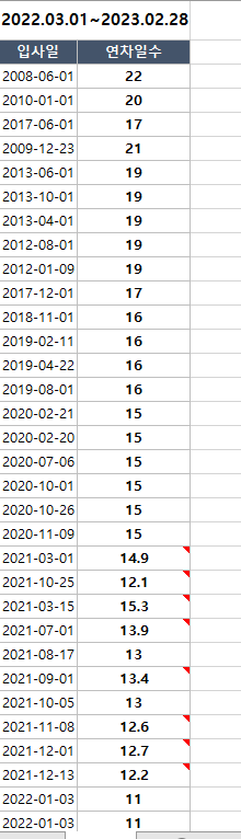 또한, 21년도에 입사하신 분 부터는 전년도 재직일 수 비례 계산+ 월차로 주어지는데