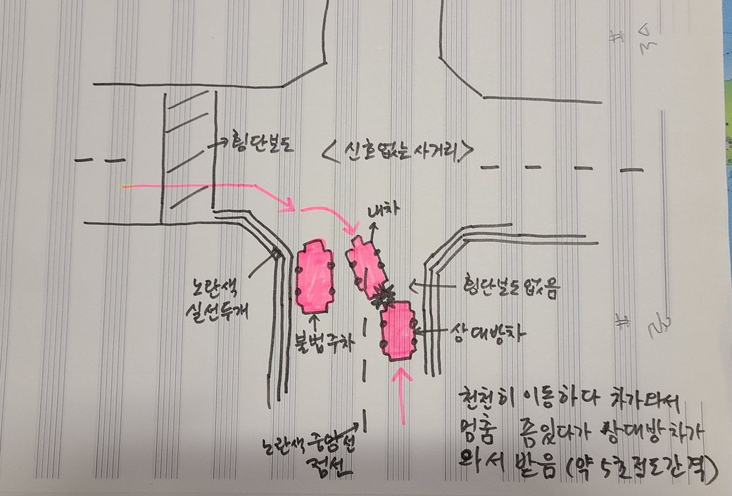 불법 주차된 차량을 피해 주행하려다 반대차선에서 오는 차량을 보지 못해 접촉사고 났습니다..