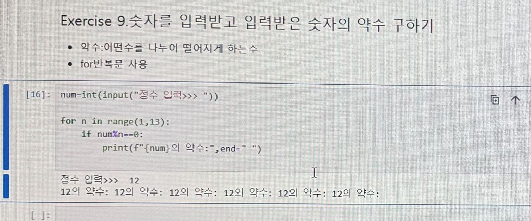 먼저 프린트문에서 약수를 뽑아내셔야 하는데 따로 n을 빼주지 않으셔서 약수가 나오지 않으셨고, end부분을 한칸 띄우신 건 구별을 하기 위함이라고 보여지는데, 매번 12의 약수라는 말이 나오니 출력부분에서 가독성이 떨어져보입니다.