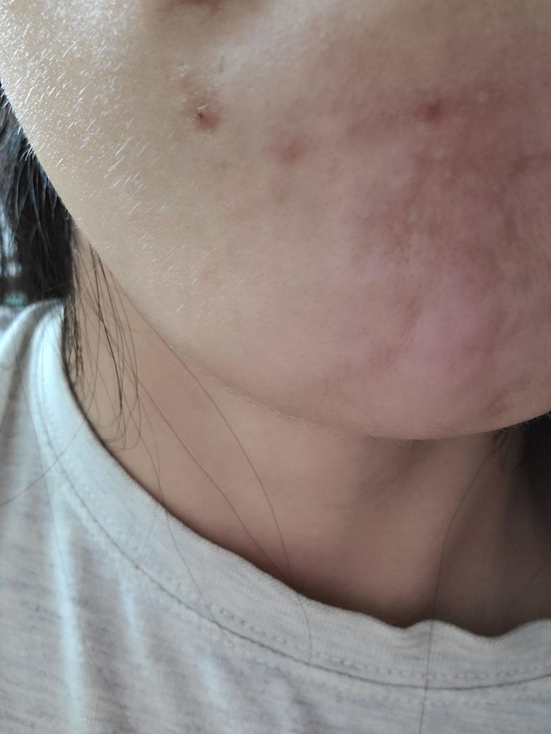 다른데는 피부가 다 좋은데 턱밑이나 입주변에 티나게 여드름이 났고 제가 잡아 뜯었다가 이렇게 흉지고 말았어요 ㅠㅠ