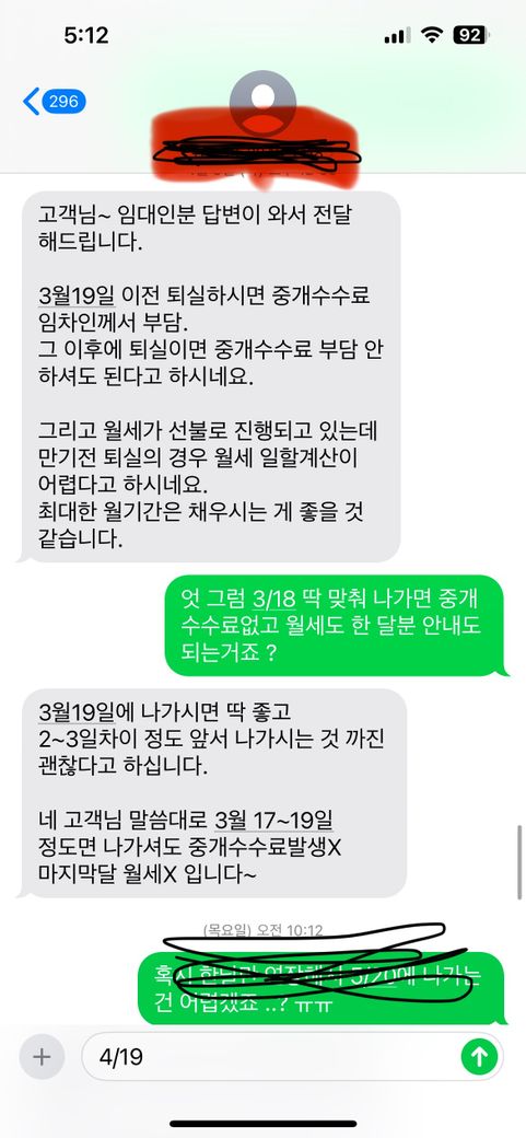 안녕하세요. 중도퇴실 (만기한달전 퇴실)입니다. 원래 만기는 4월18일이었고 중개수수료와 월세 일할계산 문의를 드렸습니다. 분명 3/18 딱 맞춰 퇴실하면 중개수수료도 없고 월세 한 달분도 안내도되냐고 물어봤고3/17~3/19에 나가면 중개수수료 x 마지막달 월세 x 라고 하셨습니다. 오늘 전화해서 중개인에서 보증금관련 얘기를 하니, 새로운 임차인이 들어오는 시점(3/19~4/18 사이)에 보증금을 돌려주신다고 임대인이 말씀하셔서 알겠다고 했습니다. 그건 이해를 하겠는데. 월세 또한 새로운임차인이 3/19 딱 맞춰 들어와야 마지막달 계산을 하지 않는것이고. 3/18 이후에 새로운 임차인이 들어오면 월세를 내야한대요.. 중개사가 자꾸 민법얘기하는데 저렇게 얘기하면 안되는 거 아닌가요?일부러 새로운 집 3월18일에 맞춰 새로운 집 계약했는데.. 마지막달 월세 물어주게 생겼어요1개의 답변이 있어요!
