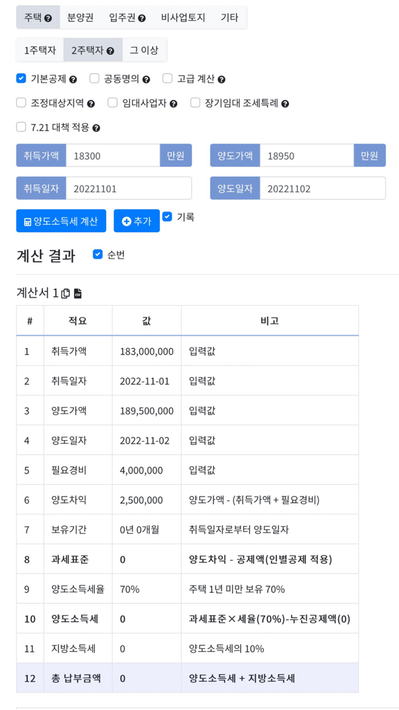 올려주신 계산내용에는 70%로 잘 적용이 되어 있고, 양도차익이 기본공제 내 금액이어서 과세표준이 없기 때문에 양도소득세도 없는 것입니다.