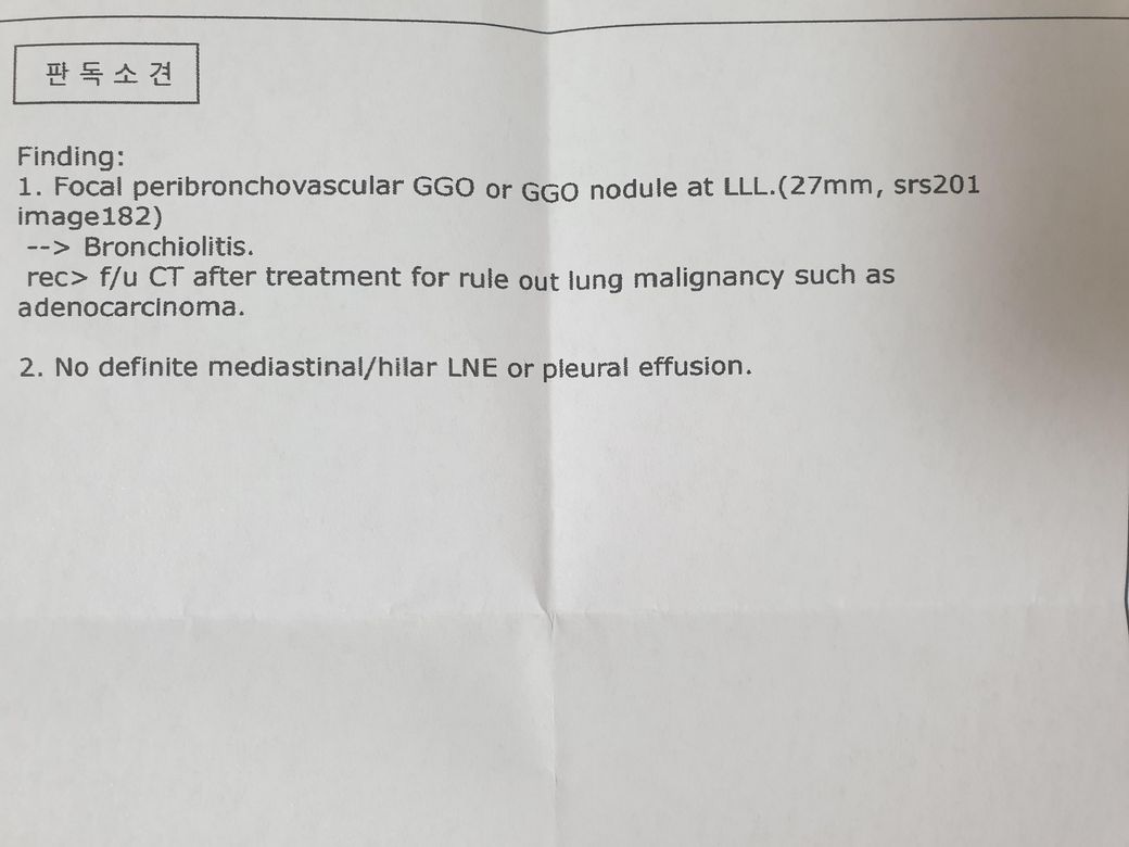 폐CT상 세기관지염 소견이 있으나 염증으로 인해 감별이 어려우므로 치료 후 악성질환 동반 여부 배제를 위한 추적검사를 권하고 있습니다.