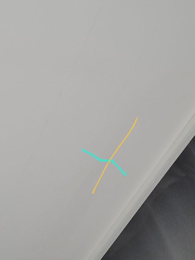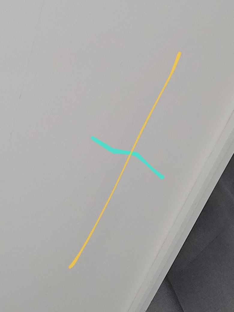 그냥 사진 찍으니까 안보여서 선으로 표시해놓은 사진도 같이 올립니다 주황색 선 기준으로 왼쪽은 튀어나오고 오른쪽은 들어가있어요 누수라던지 그런건 없습니다