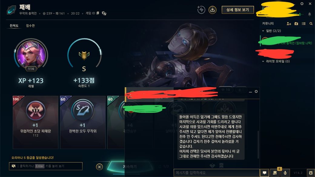 이 상태로 게임 시작했고 저는 바로 차단해서 뭐라고 하는지도 모르는 상황이였습니다. 빨간색은 아예 게임을 안했고요.