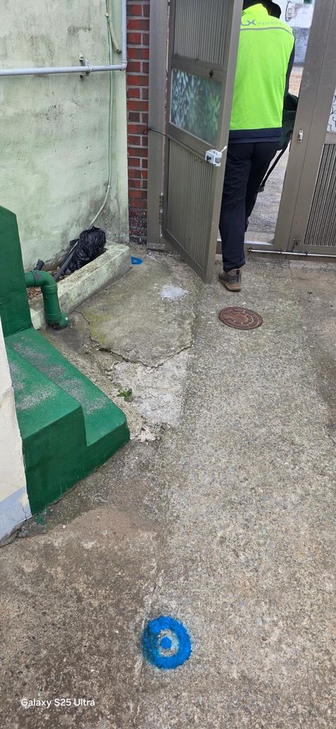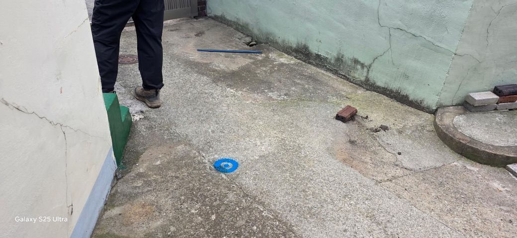 첫번째 두번째 사진은 뒷집의 내부에서 찍은 사진입니다. (파랑 락카 표시가 측량 경계)