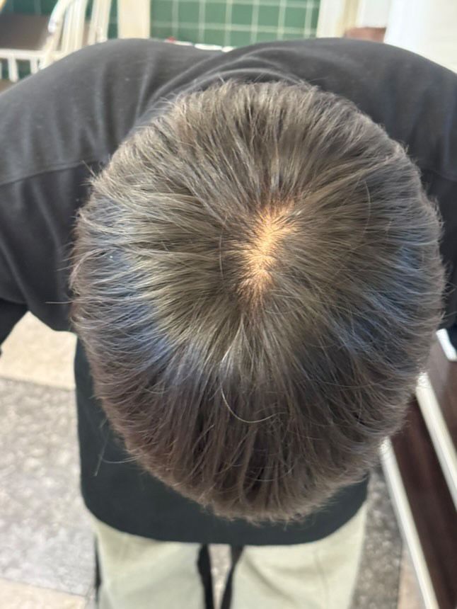 사진상으로 보기에 정수리에 모발이 적은것으로 보이나 이것만 가지고 탈모를 판단할수는 없고 두피검사 받아보세요