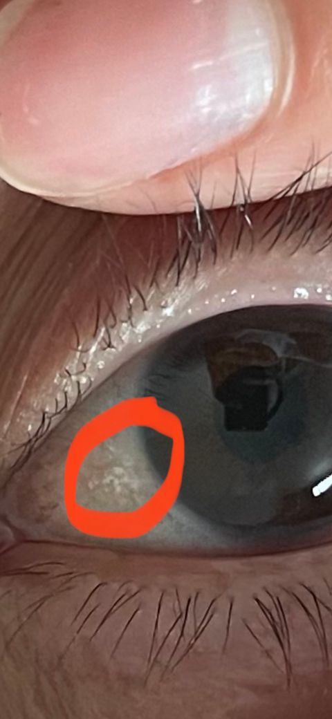 정확한 확인은 세극등현미경을 통하여 진료를 보시는것이 가장 정확하나 모양상으로 보아 검열반 혹은 결막모반으로 보이며, 두경우 모두 급하게 치료할 필요는 없습니다. 크기와 색깔, 모양상의 변화가 없다면 점과 비슷하다고 생각하시면 되며 미용상 신경 쓰이지 않는다면 굳이 치료가 필요없는 상태입니다.