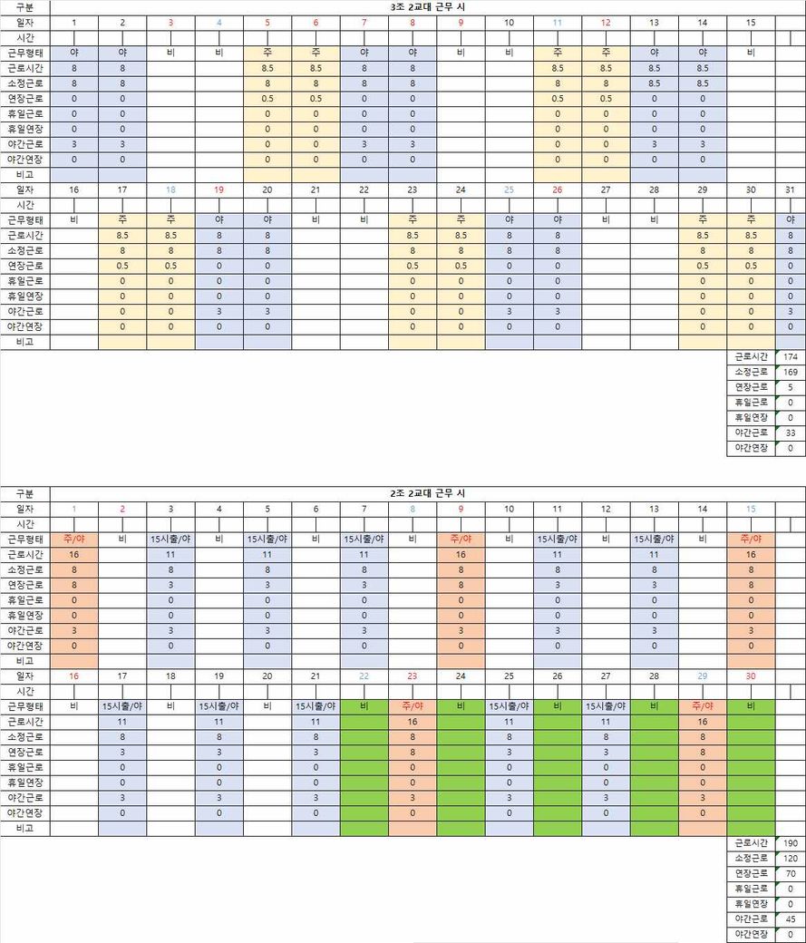 11월 한달간, 3조 2교대 형태로 근무를 하게되면, 주간 10일, 야간 10일, 휴무 10일을 근무해야 하지만, 2교대 근무를 진행하면서 근무 15일, 휴무 15일 을 하게 됩니다.