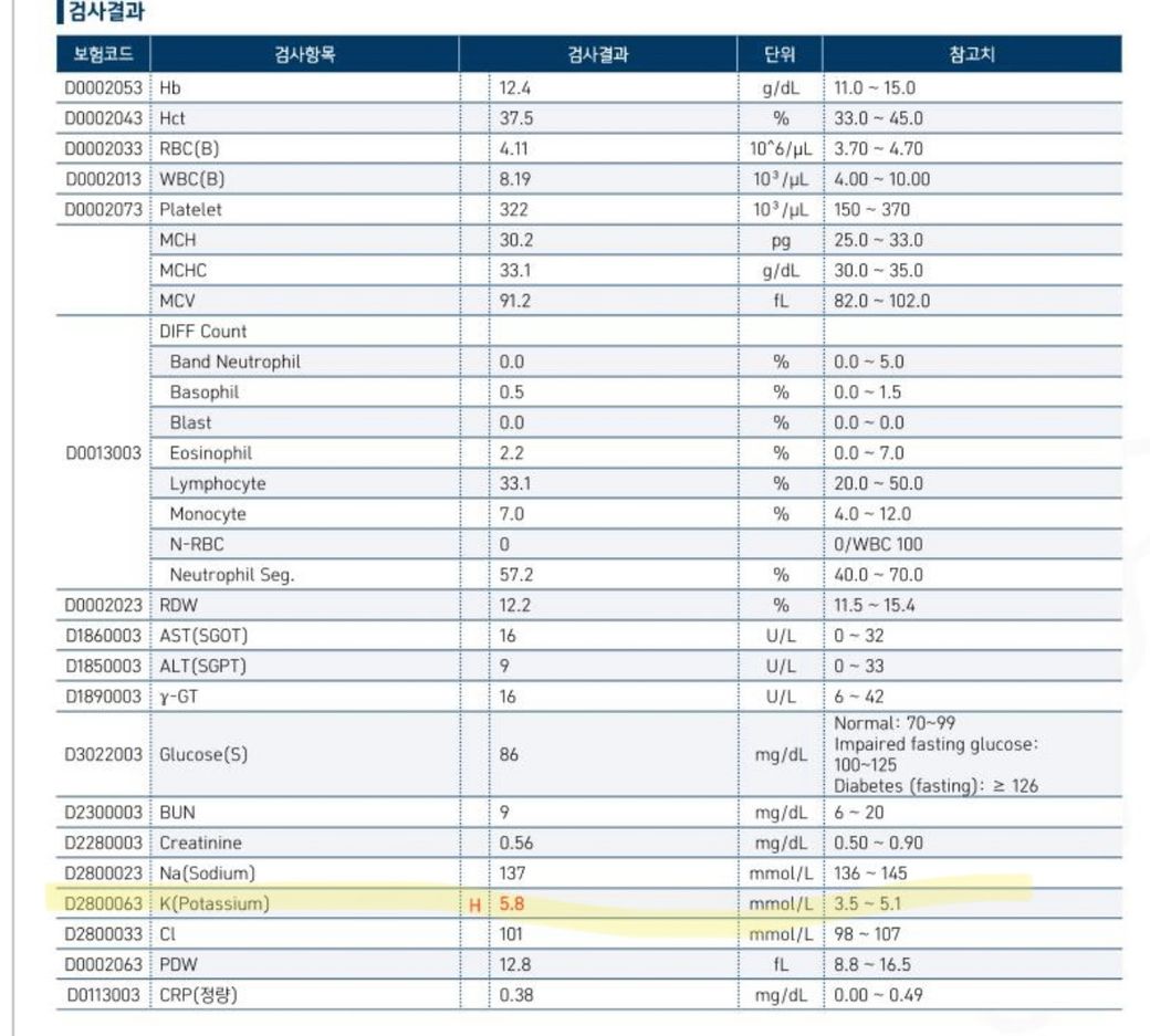 안녕하세요. 채홍석 의사입니다. 칼륨 수치에 대해서 병원에서 괜찮다고 하였으면 크게 걱정하실 건 없는 것 같으며 그래도 불안하시면 1-2주일 뒤에 피검사를 다시 해보시기 바랍니다.