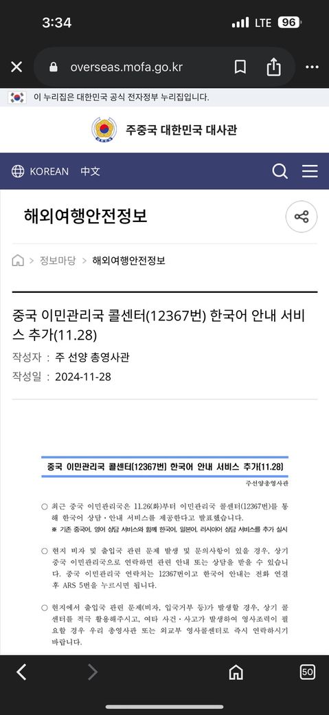증국 이민국 콜센터 전화번호 12367 연결방법 아시는분?