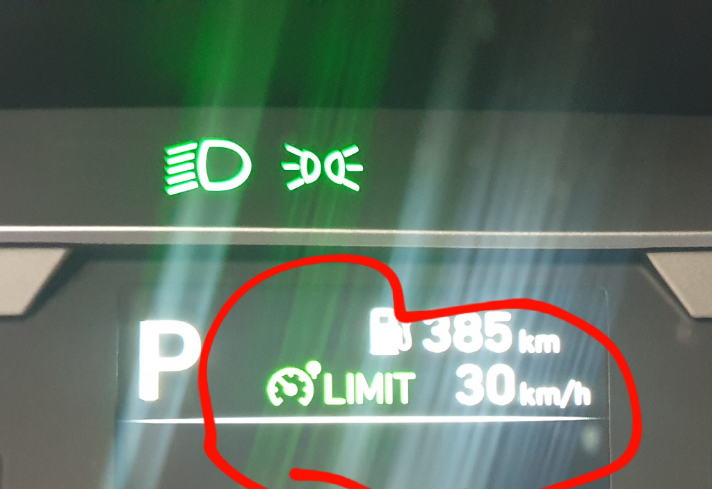 기름이 다되어서 불이 계속 들어오고 있었는데 잠시 정차했다가 출발하는데 갑자기 이표시가 뜨면서 속도가안나고 그때 상황에 기름은 32키로 남았다고 표시되어있었어요.