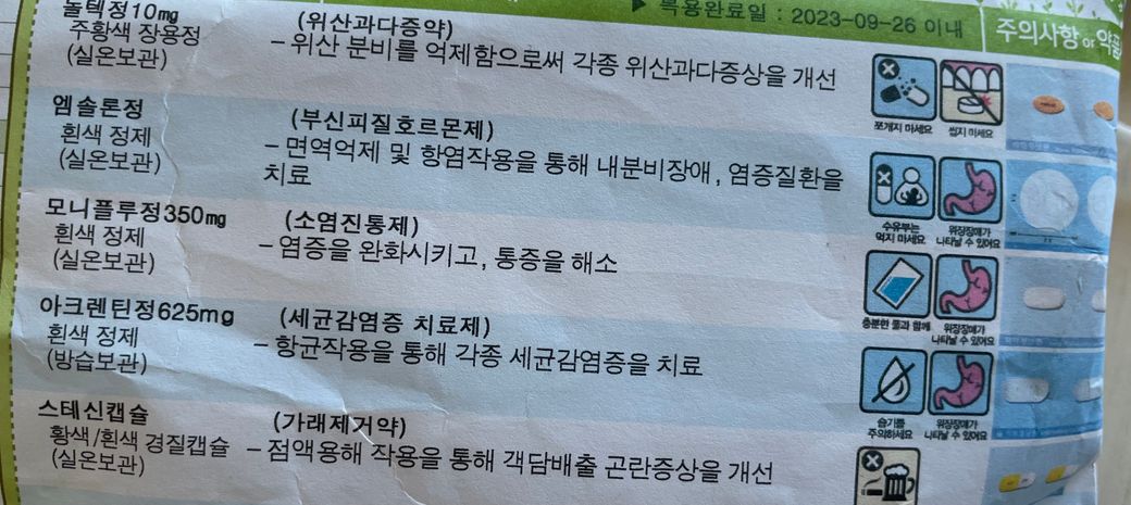 놀텍정 / 엠솔론정 / 모니플루 / 아크렌틴정 / 스테신캡슐 을 복용하시면서
