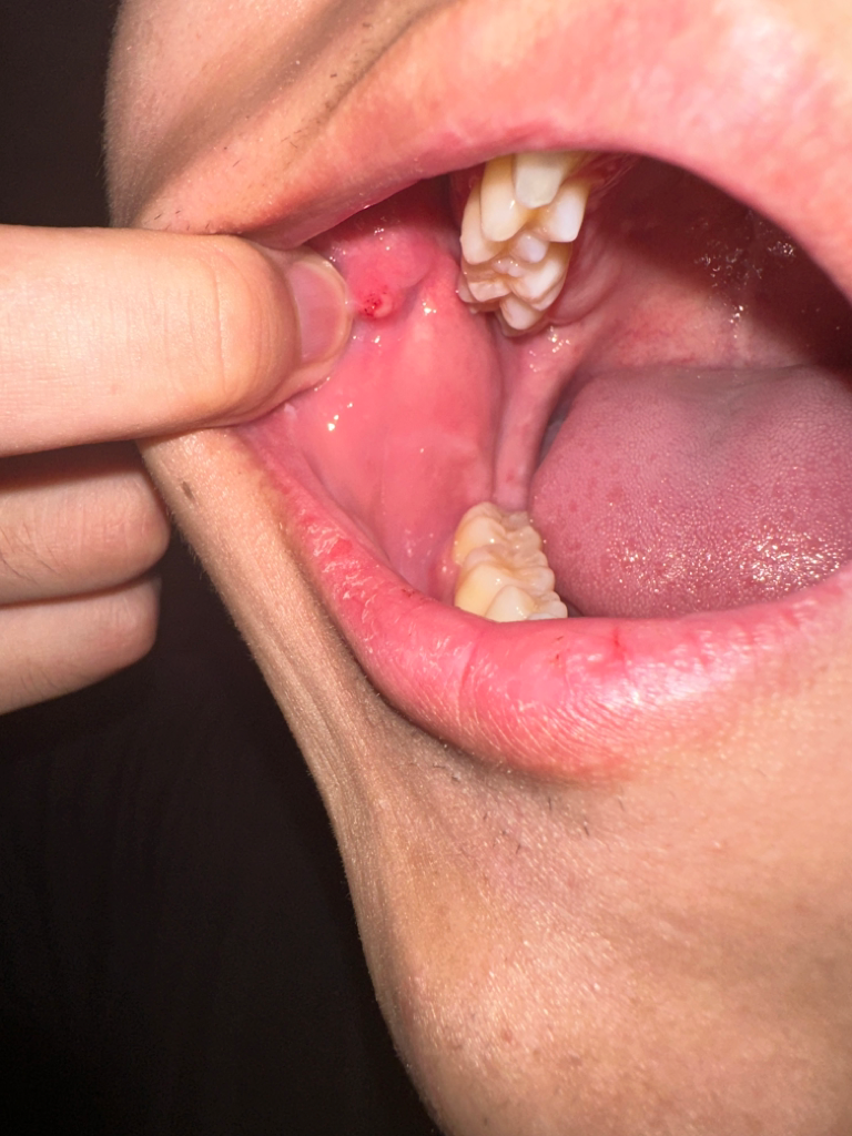 그냥두면 저절로 없어집니다. 아마도 옆으로 자면서 볼안쪽 점막이 압박을 받아 그런 것으로 보입니다.