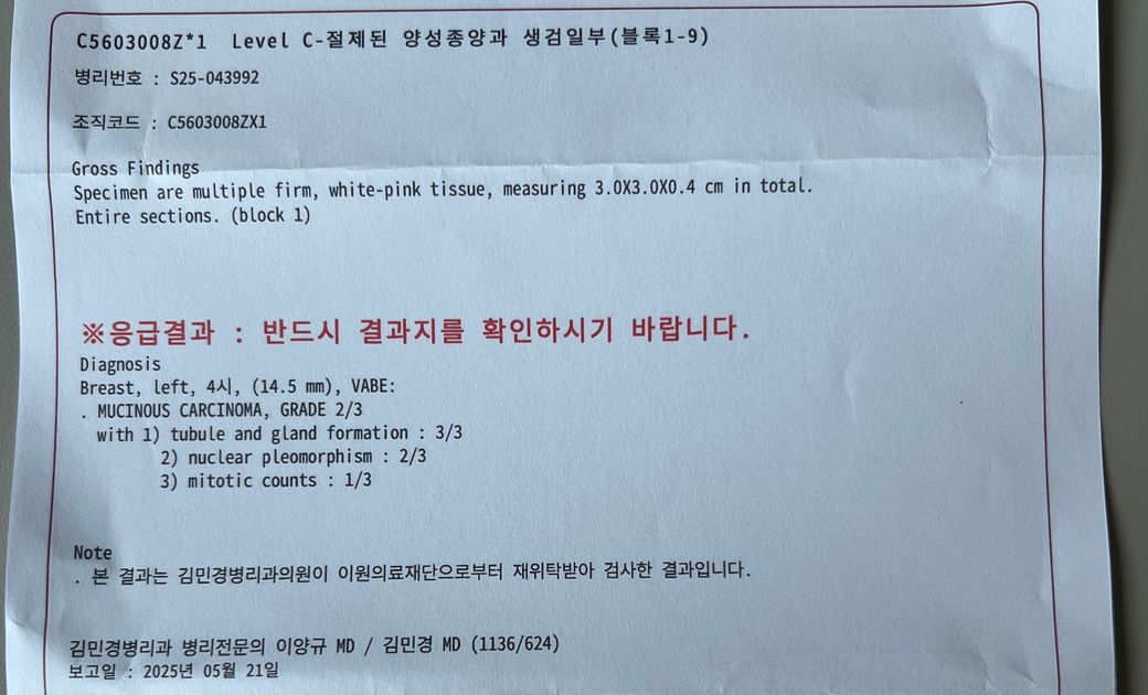 2025년 5월 15일 집 근처 유명한 유방외과 방문하여 검사할땐 혹이 피부조직이랑도 너무 가까워서 맘모톰이 필요해 보인다하여 맘모톰 시술 후 조직검사 받았어요.