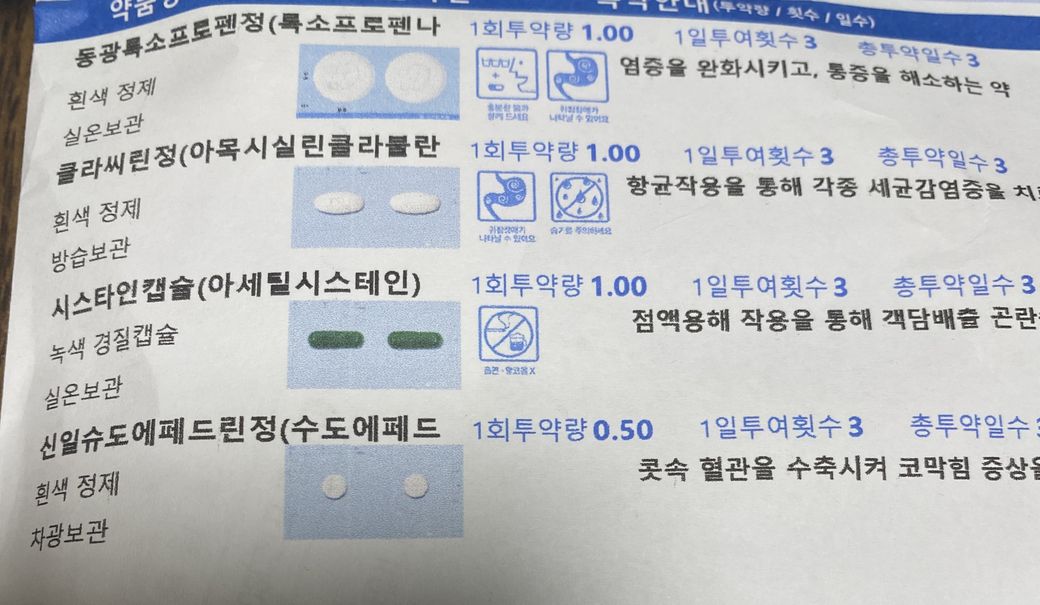 코로나약은 동광록소프로펜정(록소프로펜나/클라씨린정(아목시실린클라불란/시스타인캡슐(아세틸시스테인)/신일슈도에페드린정(수도에페드