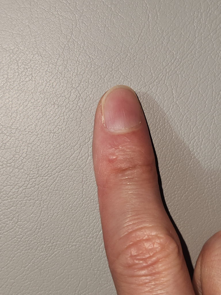 마찰, 압력, 염증 등에 의한 일시적인 물집일 가능성도 있으나, 딱딱해지며 오래 지속되는 경우에는 사마귀일 가능성도 있습니다. 이 경우에는, 피부과 진료를 통해 제거하시는 것이 좋겠습니다.