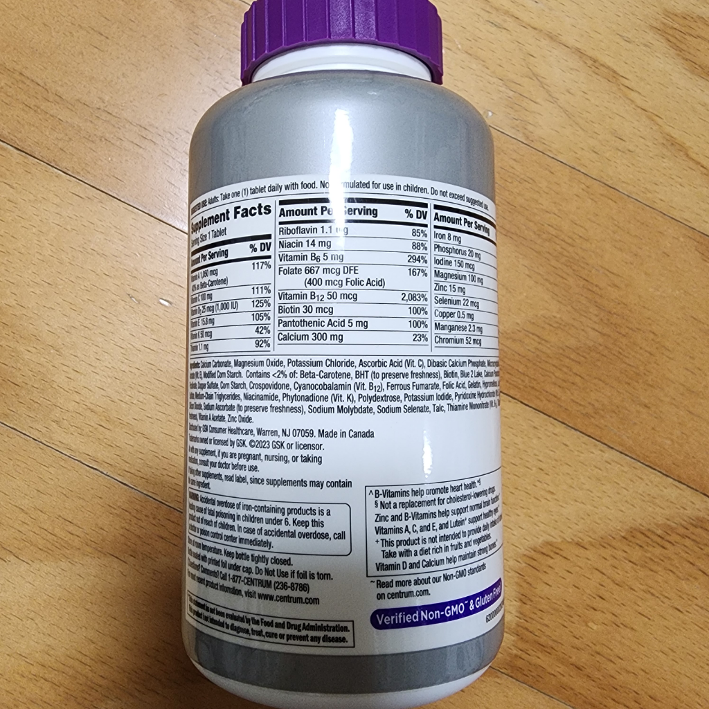 아래의 센트룸실버우먼 제품은 현재 드시는 비타민B컴플렉스나 비타민D, 칼슘, 마그네슘 등이 성분이 중복될 수 있습니다