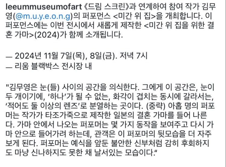 해당 전시는 리움 블랙박스 전시장 내에서 열리며 저녁 7시부터 8시까지이군요.