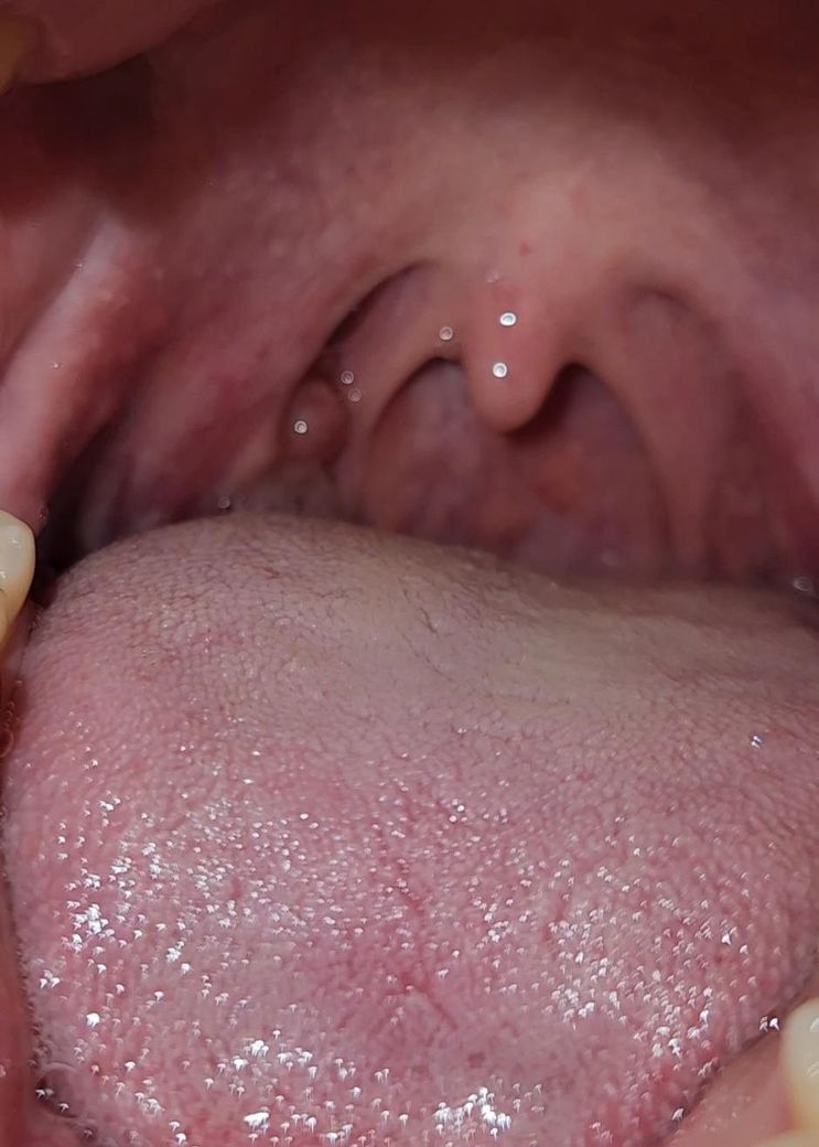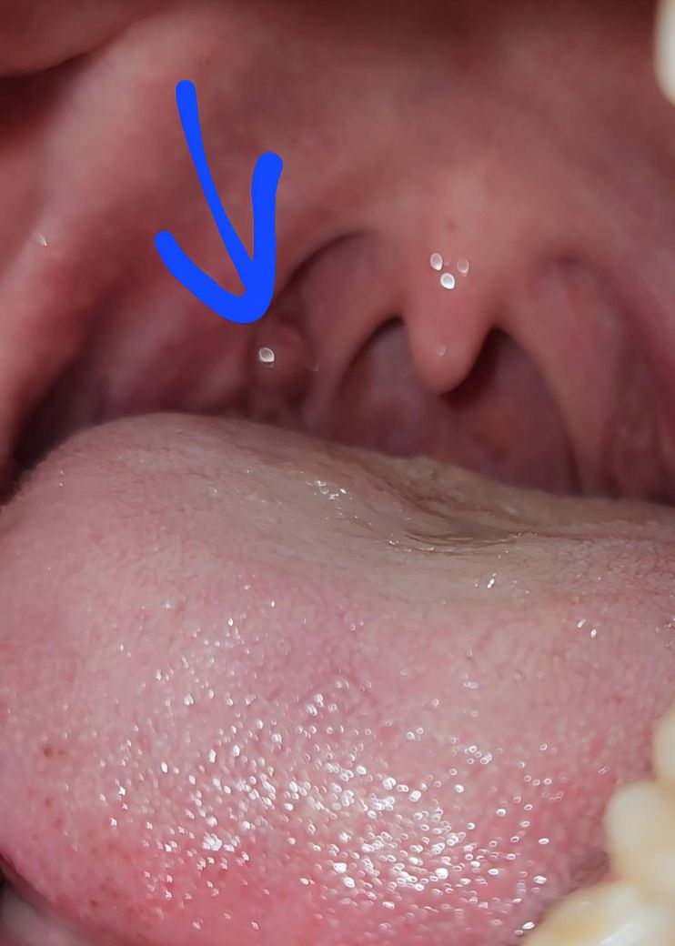 표시해주신 부위는 편도 기둥(구개궁) 바로 옆 점막에 작게 돌출된 구조로 보입니다. 색이 주변 점막과 유사하고 표면이 매끈하며, 고름이나 궤양 형태는 관찰되지 않습니다. 이런 형태는 종양보다는 정상 구조의 변이, 또는 점막 자극에 따른 일시적 부종이 더 흔한 양상입니다.