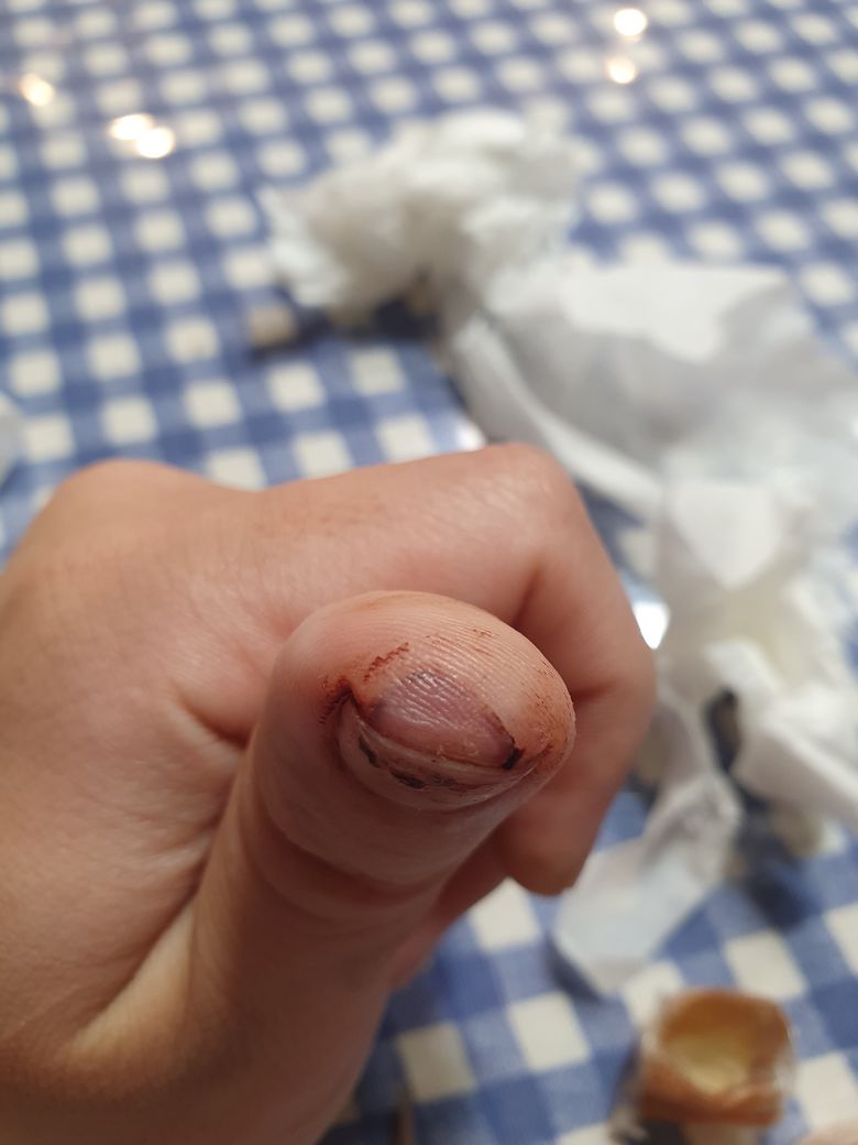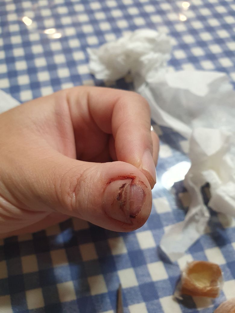 요리하다가 식칼에 손 끝이 반달모양으로 도려내듯 손톱과 함께 베였습니다. 완전 떨어진게 아니라 상처부위 왼쪽에서 오른쪽으로 80% 정도 칼이 들어갔네요.