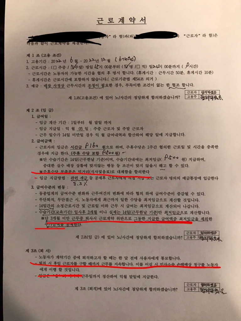 제가 빨간 줄 그은 부분 말고도 위반사항이 있는지 확인부탁드리겠습니다! 그리고 만약 위반되는 경우라면 제가 저 계약서에 합의를 했다고 해도 저 근로계약서는 무효가 되는 것이 맞는지도 궁금합니다! 또 만약 무효라면 위반되는 항목만 무효인지, 전체가 무효인지도 궁금합니다!