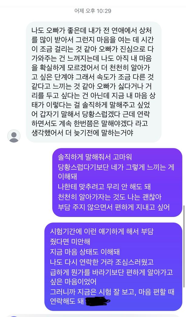 마음 굳게 다지시고 굳이 부담을 가지고 있는 상대에게 너무 급하게 갈 필요는 없다고 봅니다.