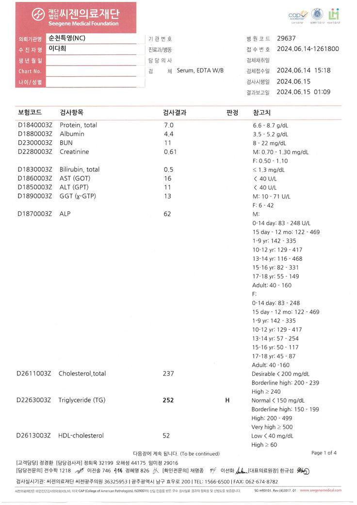 콜레스테롤 수치(LDL 150 mg/dL, HDL 52 mg/dL, 총 콜레스테롤 237 mg/dL)와 중성지방(TG 252 mg/dL)은 일부 범위(150 이상)가 높아 심혈관 질환 위험이 있으므로 식이조절 및 운동이 필요합니다.