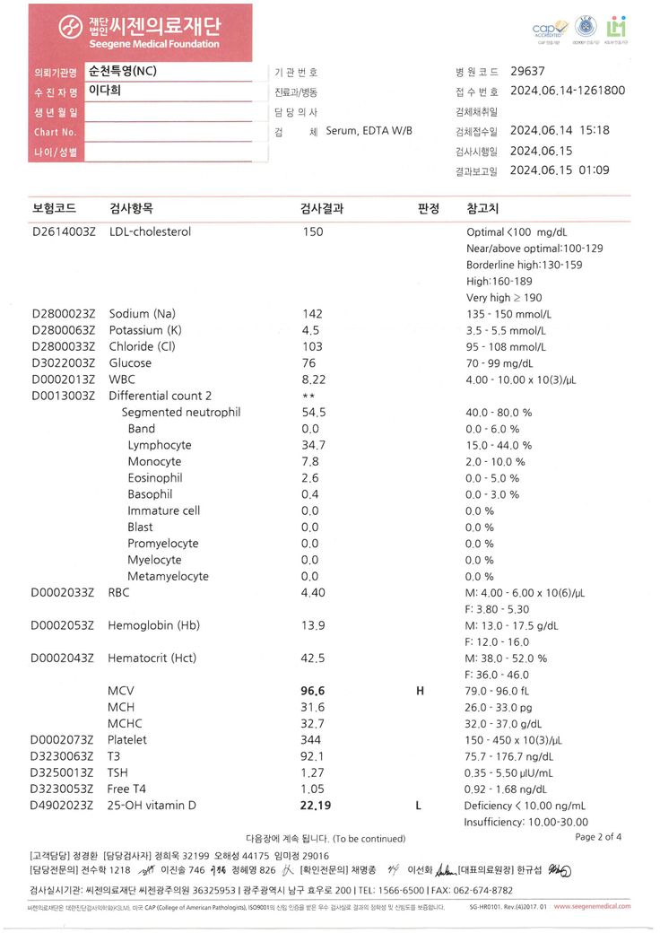 나트륨(142 mmol/L), 칼륨(4.5 mmol/L), 염화물(103 mmol/L) 등의 전해질 수치는 정상 범위에 있으며, 글루코스(76 mg/dL)는 정상 범위(70-99 mg/dL) 내에 있습니다. 백혈구(WBC 8.22 x10^3/μL) 및 적혈구(RBC 4.40 x10^6/μL), 혈색소(Hb 13.9 g/dL), 헤마토크릿(Hct 42.5%) 등의 수치도 정상 범위 내에 있습니다.