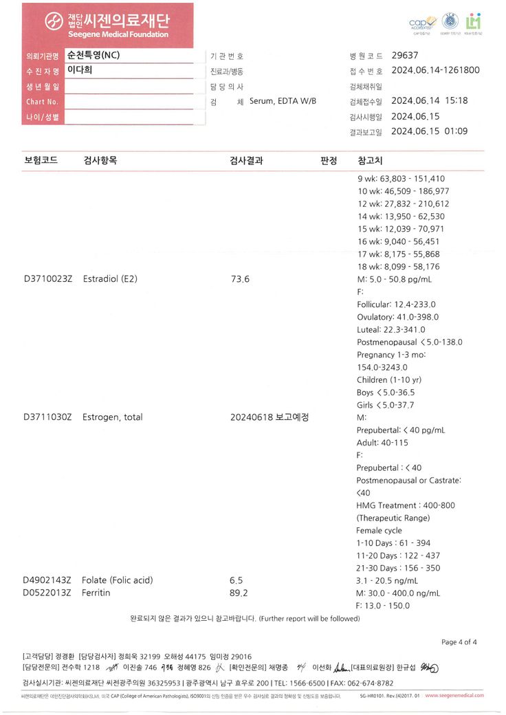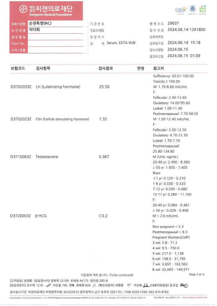 FSH(난포 자극 호르몬) 수치는 7.32 mIU/mL로 정상 범위(1.50-12.40 mIU/mL)에 속해 있으며, 이는 난소 기능을 평가하는 데 참고될 수 있습니다. 테스토스테론 수치는 0.367 ng/mL로 정상 범위(0.084-0.481 ng/mL)에 속하며, β-HCG 수치는 0.2 mIU/mL 이하로 정상입니다.