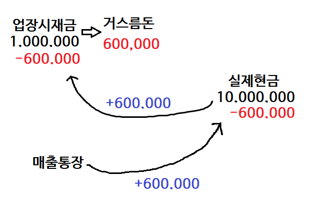 그 이후 실제 현금도 10,000,000원을 유지해야하기에 매출이 발생하면 매출통장에서 현금을 인출해 실제 현금을